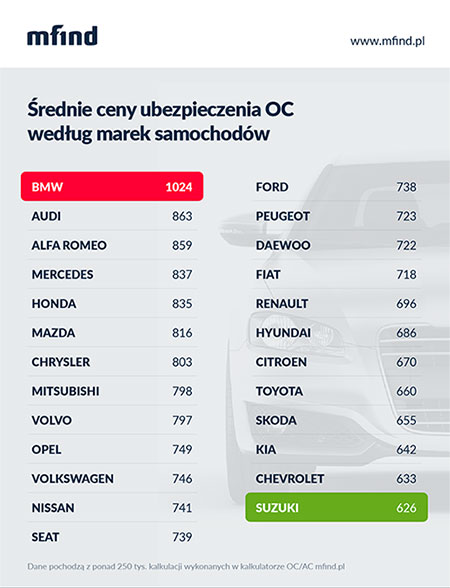Zdecydowanie najwi臋cej za ubezpieczenie OC p艂ac膮 kierowcy BMW - 艣rednio a偶 1024 z艂. Nieco mniejsze koszty ponosz膮 w艂a艣ciciele Audi (863 z艂) oraz Alfa Romeo (859 z艂). Z kolei na tanie ubezpieczenie OC mog膮 liczy膰 kierowcy samochod贸w marki Suzuki (626 z艂), Chevrolet (633 z艂) oraz Kia (642 z艂).